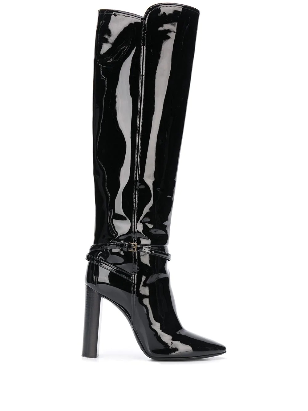 110mm patent-leather boots Thinking about going out today? Because these black patent leather boots from Saint Laurent are ready to make you shine all night. Come on Barbie, let's go party. Highlights - Black - Patent leather - Pointed toe - Knee-length - High stacked heel Made in Italy Composition Lining: Calf Leather 100% Sole: Calf Leather 100%, Rubber 100% Outer: Patent Leather 100% SIZE & FIT Measurement CIRCUMFERENCE 14.17 in(36 cm) HEEL 4.33 in(11 cm) HEIGHT 16.14 in(41 cm)