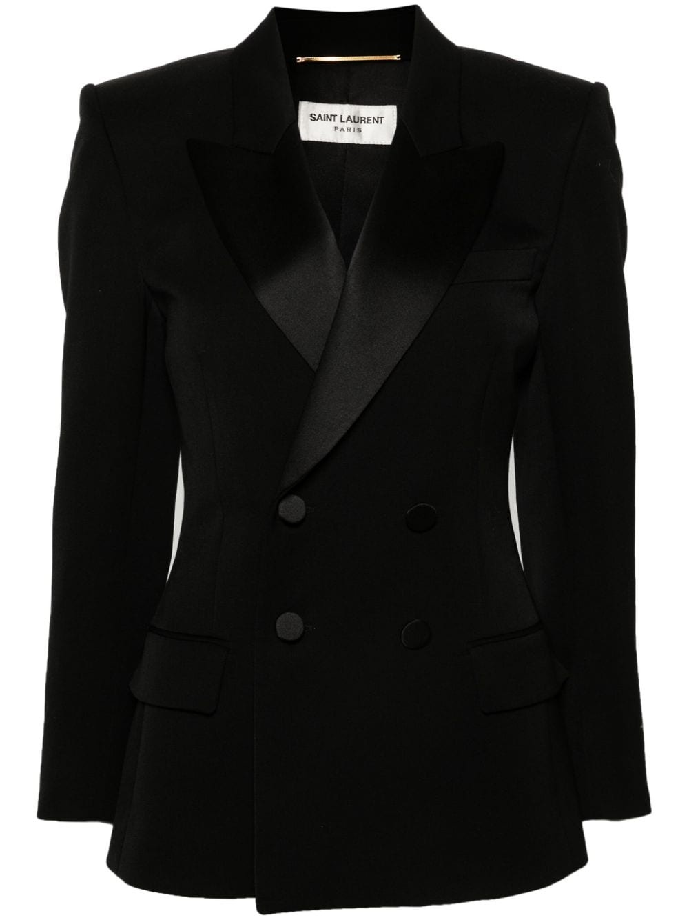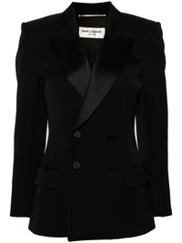 peak-lapels double-breasted blazer Spun from wool, Saint Laurent's blazer is tailored to a classic double-breasted silhouette and is complete with peak lapels. Highlights - Black - Wool - Interlock twill weave - Peak lapels - Double-breasted button fastening - Shoulder pads - Long sleeves with buttoned cuffs - Chest welt pocket - Two front flap pockets - Internal jetted pocket - American rear vent - Straight hem - Silk lining Made in Italy Composition Outer: Wool 100%, Polyester 100% Lining: Silk 100%, Cotton 97%, Spandex/Elastane 3% SIZE & FIT Model measurements Height 5 ft 10 in(1.78 m) Bust/Chest 33.07 in(84 cm) Hips 36.61 in(93 cm) Waist 24.8 in(63 cm) FittingInformation Designed for a slim fit that sits just away from the body offering a close yet comfortable fit The vented hem offers movement at the rear Made from a midweight non-stretch fabric This piece fits true to size – take your usual size Washing instructions Dry Clean Only