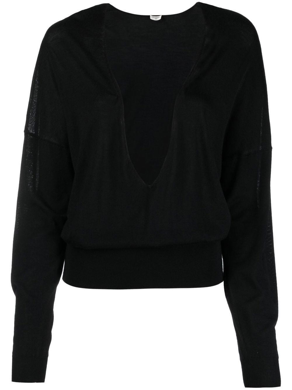 plunging V-neck knit top This Saint Laurent exaggerates the V-neck here to become a plunging centrepiece on an otherwise pared-back black knitted top. Made in Italy Composition Outer: Spandex/Elastane 2% Fabric 100% SIZE & FIT Model measurements Height 5 ft 11 in(1.8 m) Bust/Chest 31.49 in(80 cm) Hips 35.82 in(91 cm) Waist 24.8 in(63 cm) FittingInformation This piece fits true to size. We recommend you get your regular size Cut for a relaxed fit Made with a lightweight fabric Washing instructions Dry Clean Only