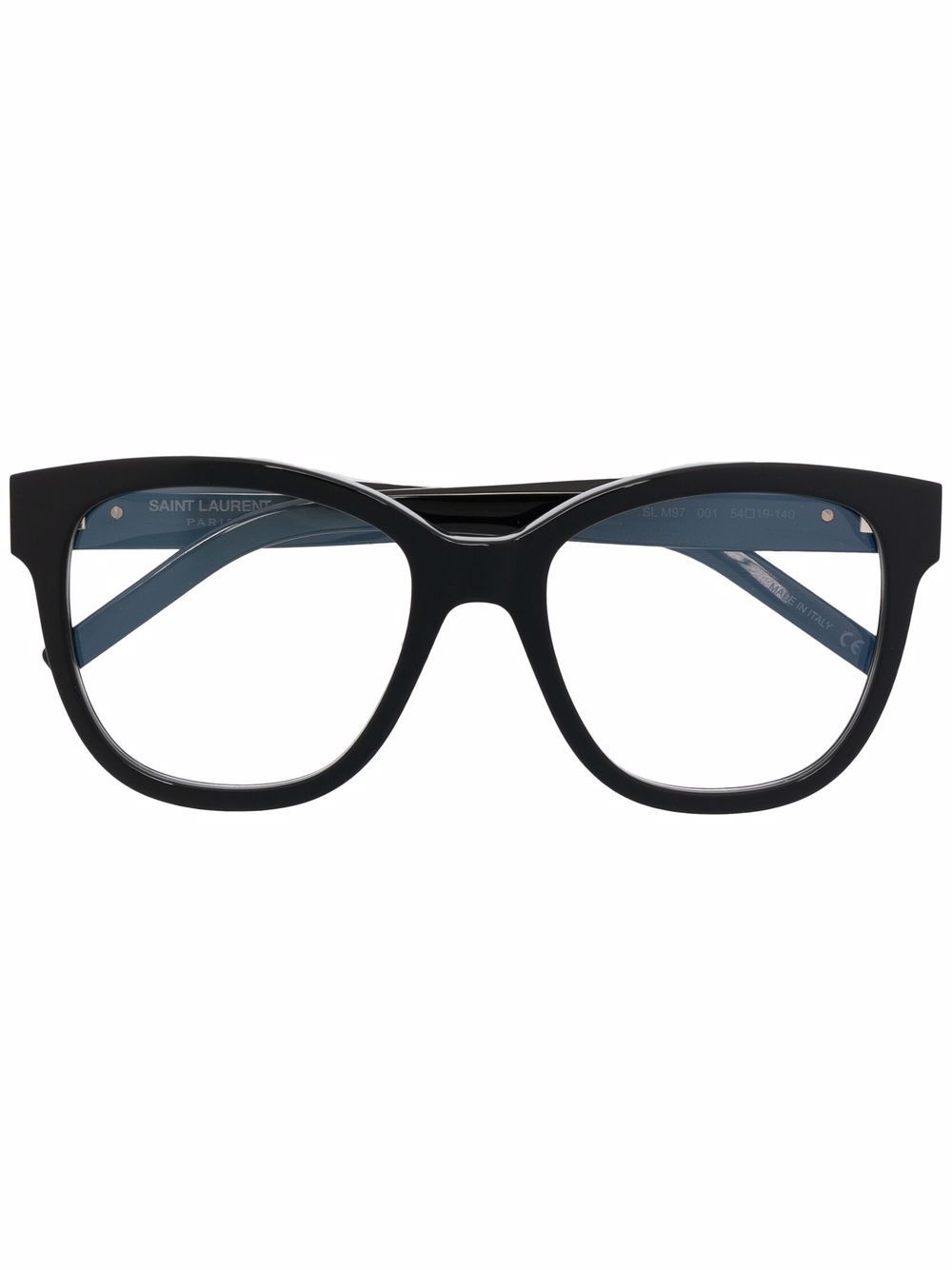 polished-effect oversize-frame glasses black acetate polished effect clear lenses oversize frame raised bridge straight arms curved tips These glasses come with a protective case. Made in Italy Composition Acetate 100% SIZE & FIT Measurement Arm Length 5.51 in(14 cm) Bridge Width 0.74 in(1.9 cm) Lens Diameter 2.12 in(5.4 cm) Total Width 5.66 in(14.4 cm)