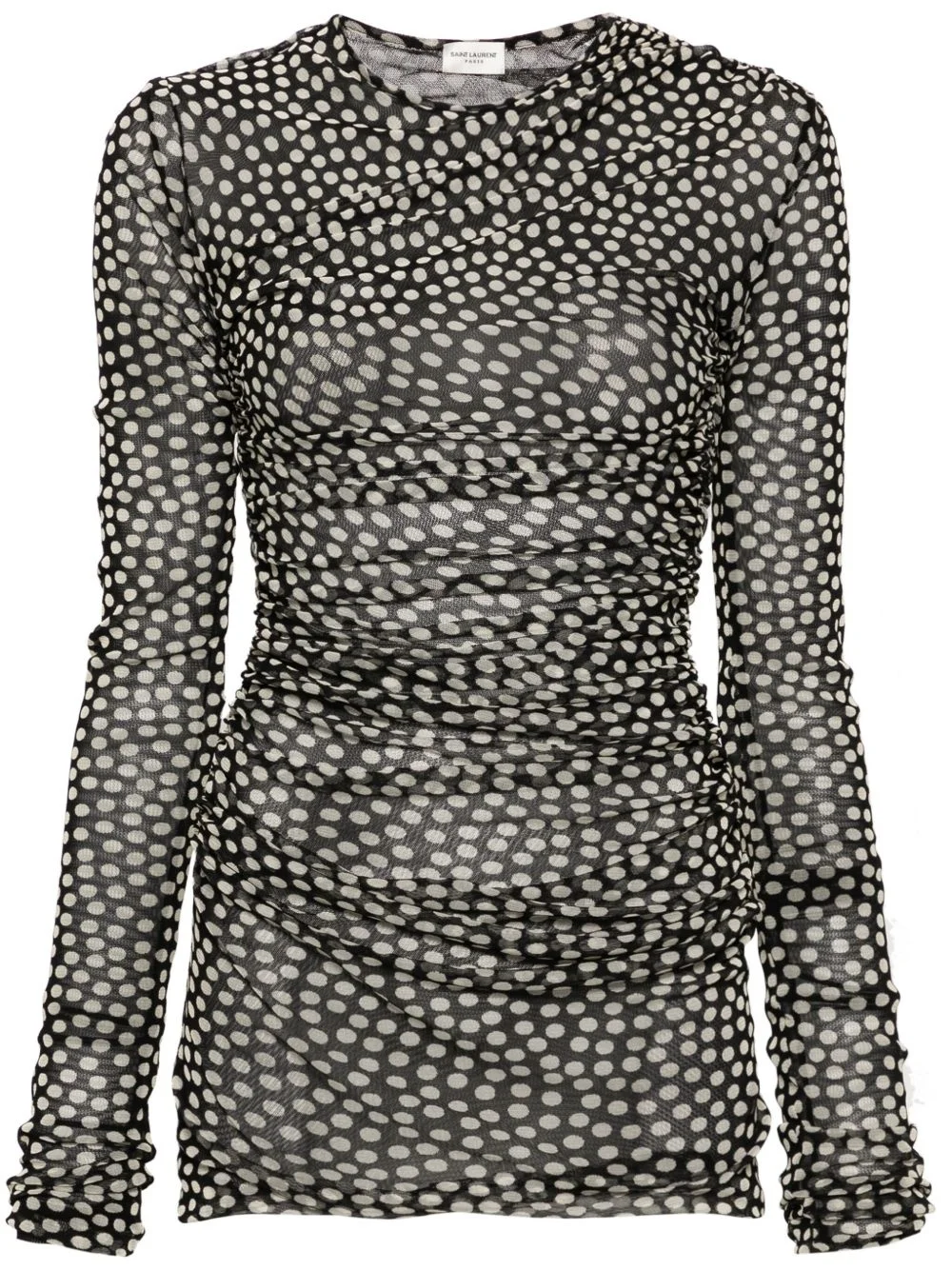 polka-dot ruched tulle minidress Highlights - Black/ecru - Tulle - Semi-sheer construction - Polka dot print - Ruched detailing - Round neck - Long sleeves - Thigh-length Made in France Composition Lining: Polyamide 74%, Elastane 26% Outer: Polyamide 100% SIZE & FIT Model measurements Height 5 ft 10 in(1.78 m) Bust/Chest 33.07 in(84 cm) Hips 36.61 in(93 cm) Waist 24.8 in(63 cm) Measurement SLEEVE LENGTH 36.22 in(92 cm) HIPS 27.55 in(70 cm) LENGTH 31.1 in(79 cm) WAIST 22.04 in(56 cm) BUST 27.55 in(70 cm) FittingInformation Designed for a close fit throughout Slightly short in length; consider your own measurements Made from a lightweight fabric This piece fits true to size – take your usual size Washing instructions Dry Clean Only