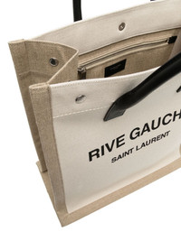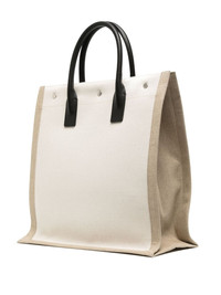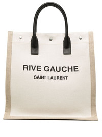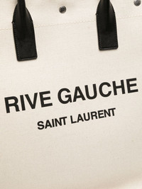 Rive Gauche North/South tote bag Crafted in Italy from cotton canvas, this iconic piece from Saint Laurent features a versatile shopper tote silhouette, while the 'Rive Gauche' and signature print on the front offers graphic branded appeal. Highlights - Cream white/black - Cotton - Logo print to the front - Silver-tone hardware - Circular top handles - Press-stud fastening - Main compartment - Internal zip-fastening pocket - Internal logo patch - This piece comes complete with a protective dust bag. Made in Italy Composition Lining: Cotton 100% SIZE & FIT Model measurements Height 6 ft 2 in(1.87 m) Bust/Chest 34.25 in(87 cm) Hips 36.22 in(92 cm) Waist 29.52 in(75 cm) Measurement DEPTH 6.69 in(17 cm) HANDLE 4.72 in(12 cm) HEIGHT 14.17 in(36 cm) WIDTH 14.56 in(37 cm)