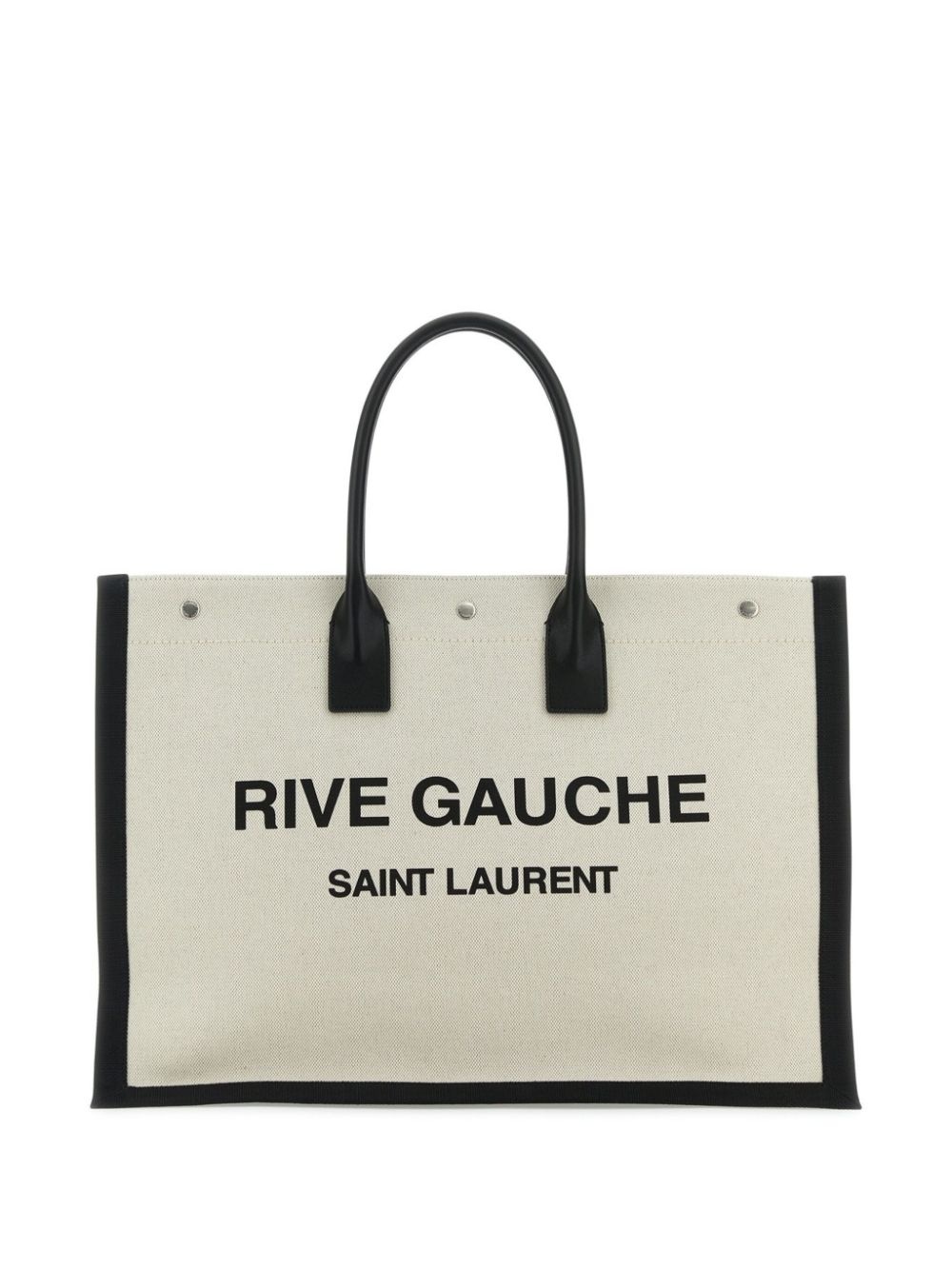 Rive Gauche tote bag Highlights - Beige/black - Cotton-linen blend - Canvas - Logo print to the front - Leather top handles - Main compartment - This piece comes complete with a protective dust bag. Made in Italy Composition Outer: Cotton 45%, Linen/Flax 45%, Calf Leather 10% SIZE & FIT Measurement DEPTH 6.69 in(17 cm) HEIGHT 13.77 in(35 cm) WIDTH 18.89 in(48 cm) HANDLE 5.9 in(15 cm)