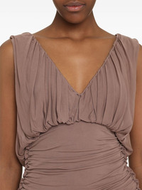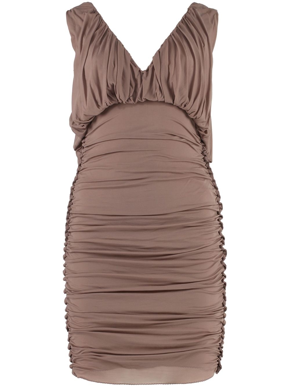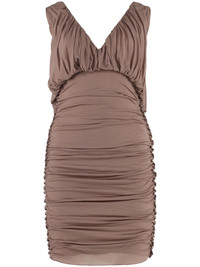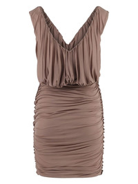 ruched V-neck minidress Vertical ruching enhances the plunging V-neckline of this Saint Laurent dress. The gathered detailing is repeated around the skirt in a horizontal direction for contrast. A beige hue unifies the piece. Highlights - Mauve - Crepe texture - Pleat detailing - Plunging v-neck - Wide shoulder straps - V-back - Ruched bodice - Straight hem - Above-knee length Made in Italy Composition Cupro 100% SIZE & FIT Measurement HIPS 27.55 in(70 cm) LENGTH 33.07 in(84 cm) WAIST 22.83 in(58 cm) FittingInformation Designed for a close fit throughout Made from a midweight non-stretch fabric, this piece offers minimal elasticity when worn This piece fits true to size – take your usual size Washing instructions Dry Clean Only