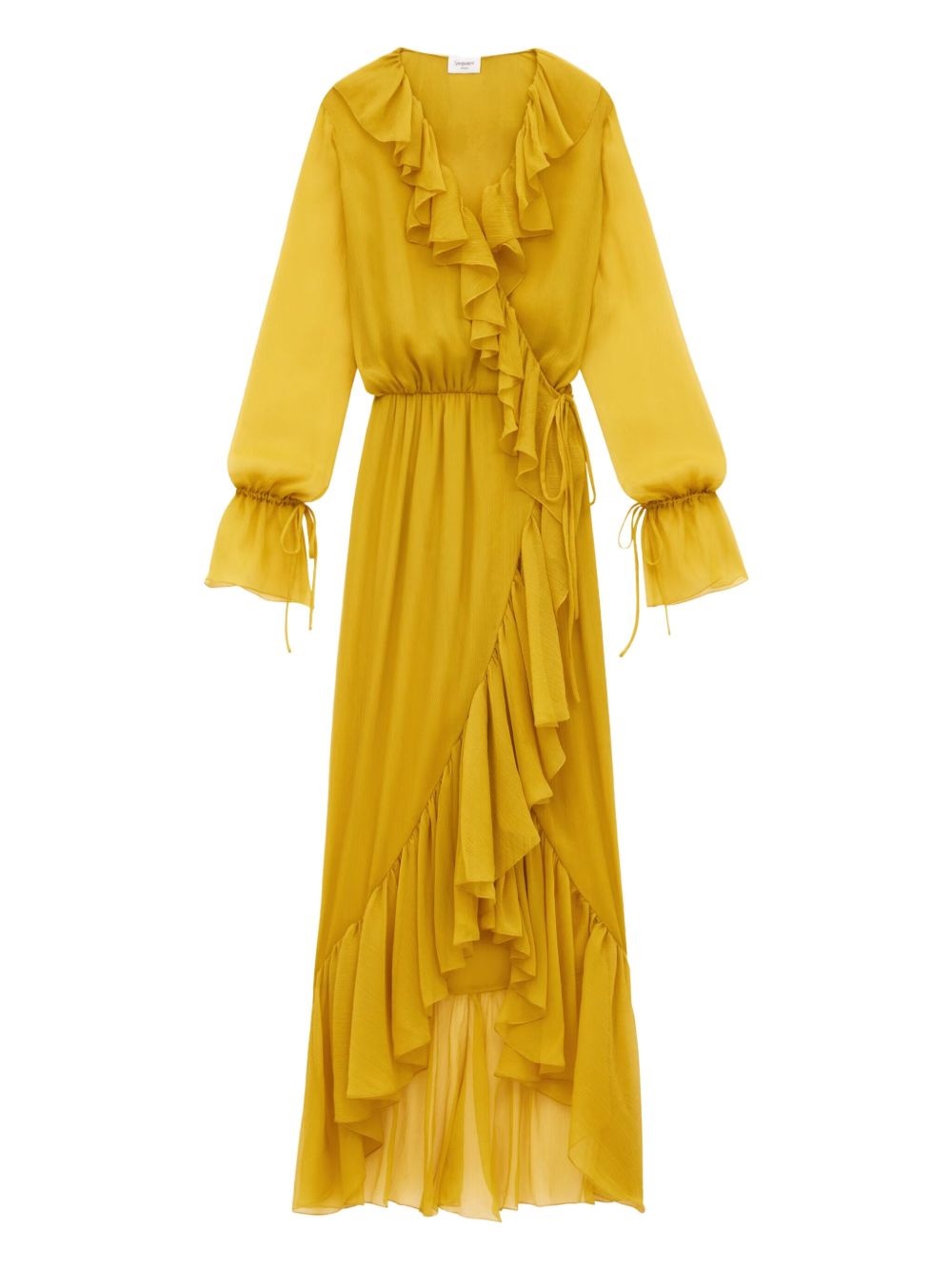 ruffled wrap dress Highlights - Mustard yellow - Side tie fastening - Drawstring cuffs - V-neck - High-low hem Made in France Composition Silk 100%