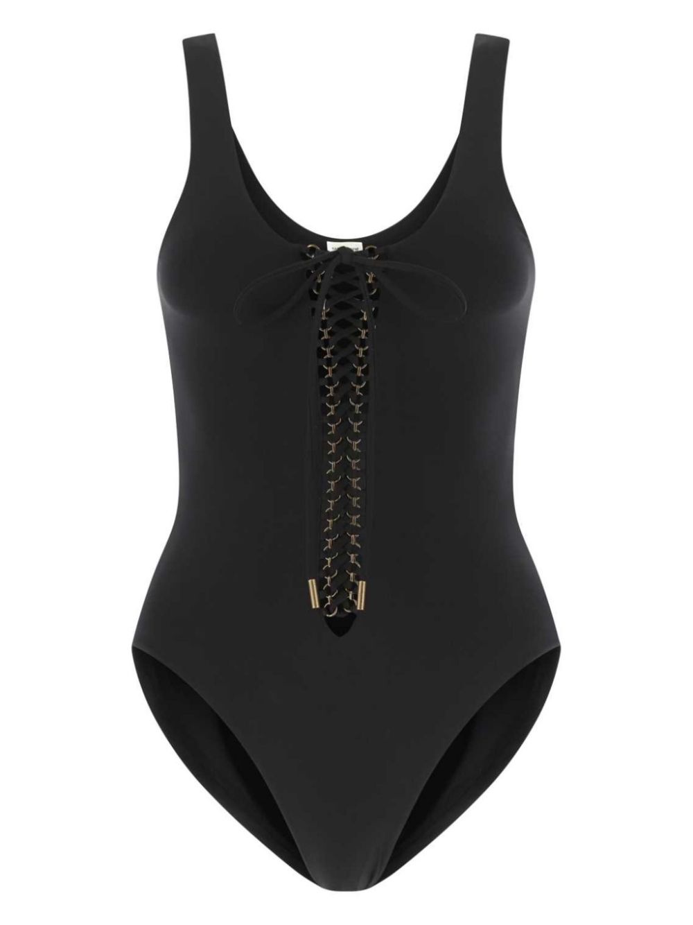 Saharienne lace-up swimsuit Taking inspiration from its Saharienne jacket, Saint Laurent presents this swimsuit with the same name. With a stretch design, this black swimsuit features a U-neck and stands out thanks to its lace-up closure punctuated with gold-tone eyelets. Made in Italy Composition Lining: Nylon 73%, Elastane 27% Outer: Nylon 62%, Elastane 38% Washing instructions Machine Wash