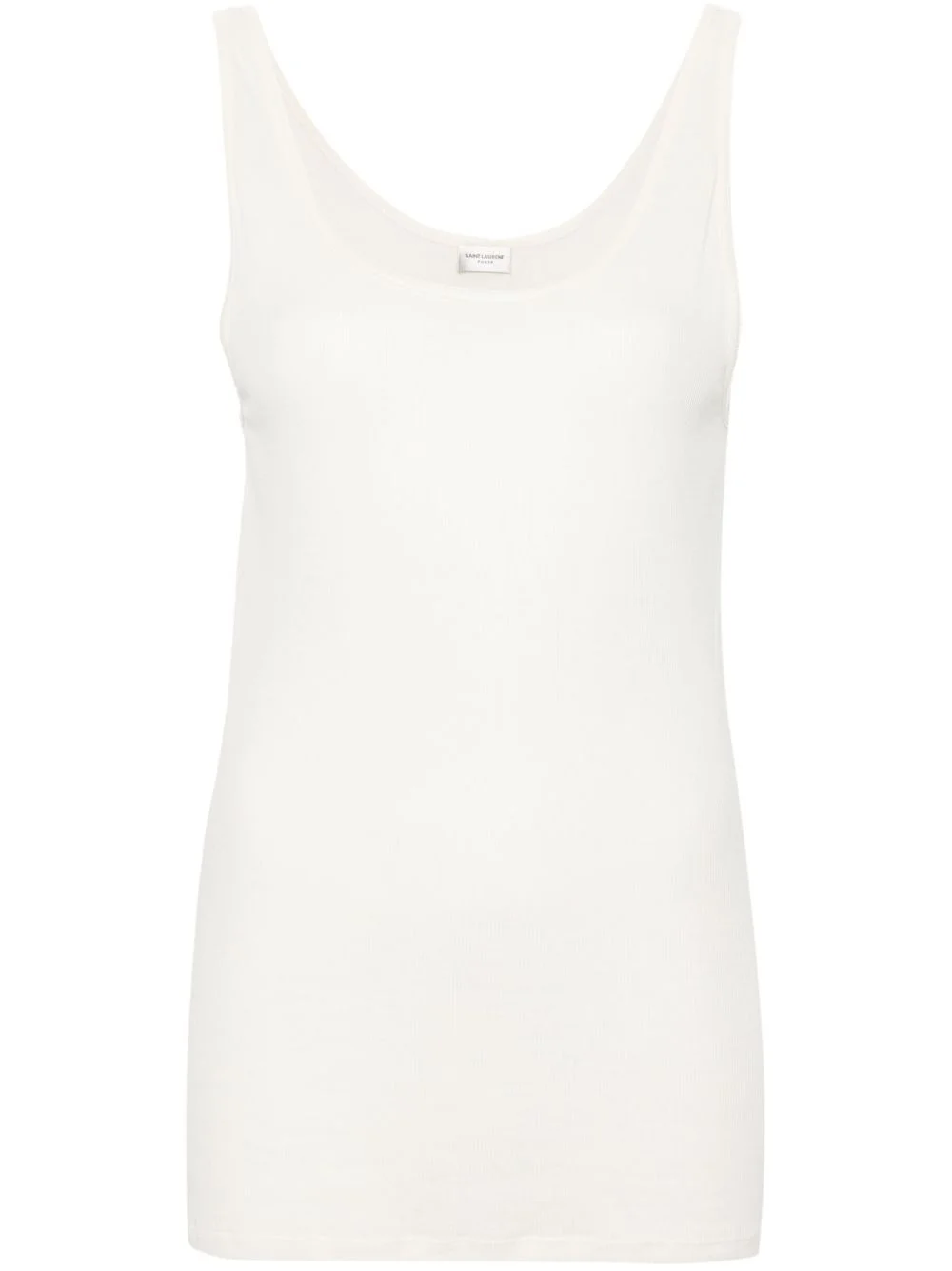 fine-ribbed semi-sheer tank top cream white semi-sheer construction fine ribbed scoop neck sleeveless straight hem Made in France Composition Modal 52%, Cotton 48% SIZE & FIT Measurement LENGTH 25.98 in(66 cm) WAIST 25.98 in(66 cm) BUST 25.98 in(66 cm) Washing instructions Hand Wash