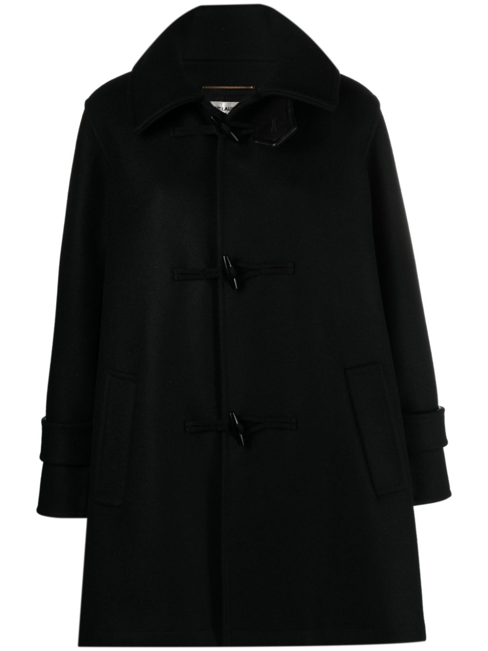 short wool duffle coat Saint Laurent is renowned for its timeless wardrobe staples, as demonstrated with this duffle coat. It's spun from black wool to a single-breasted silhouette and fastens at the front with toggles, evoking a classic look. Highlights - Black - Wool - Spread collar - Front toggle fastening - Long sleeves - Buttoned cuffs - Two side welt pockets - Straight hem Made in Italy Composition Lining: Silk 100%, Cotton 97%, Spandex/Elastane 3% Outer: Wool 100%, Lamb Skin 100% SIZE & FIT Model measurements Height 5 ft 11 in(1.8 m) Bust/Chest 31.49 in(80 cm) Hips 36.61 in(93 cm) Waist 24.4 in(62 cm) FittingInformation Designed to be fitted across the shoulders, becoming looser as it falls Made from a midweight non-stretch fabric This piece fits true to size – take your usual size Washing instructions Dry Clean Only