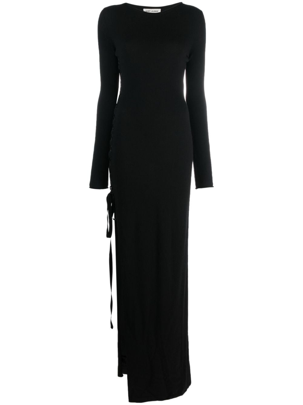 side-slit wool maxi dress Highlights - Black - Wool/silk - Rolled trim - Strap detailing - Round neck - Long sleeves - Side slit - Floor-length Made in Italy Composition Wool 100%, Silk 100% SIZE & FIT Model measurements Height 5 ft 10 in(1.79 m) Bust/Chest 32.67 in(83 cm) Hips 34.25 in(87 cm) Waist 24.4 in(62 cm) Measurement HIPS 34.64 in(88 cm) LENGTH 62.99 in(160 cm) WAIST 27.55 in(70 cm) FittingInformation Designed for a close fit throughout Made with a midweight knit, this piece offers some stretch This piece fits true to size – take your usual size Washing instructions Dry Clean Only