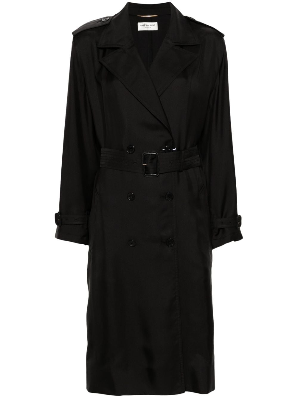 silk trench coat Highlights - Black - Silk - Detachable waist belt - Peak lapels - Double-breasted button fastening - Epaulettes - Long sleeves with belted cuffs - Two side welt pockets - Storm flap - Central rear vent - Straight hem - Knee-length Made in Italy Composition Silk 100% SIZE & FIT Model measurements Height 5 ft 9 in(1.75 m) Bust/Chest 31.88 in(81 cm) Hips 34.64 in(88 cm) Waist 24.01 in(61 cm) FittingInformation Designed to be unstructured, offering a loose fit throughout The belt offers adjustability for fitted preferences Made from a midweight non-stretch fabric This piece fits true to size – take your usual size