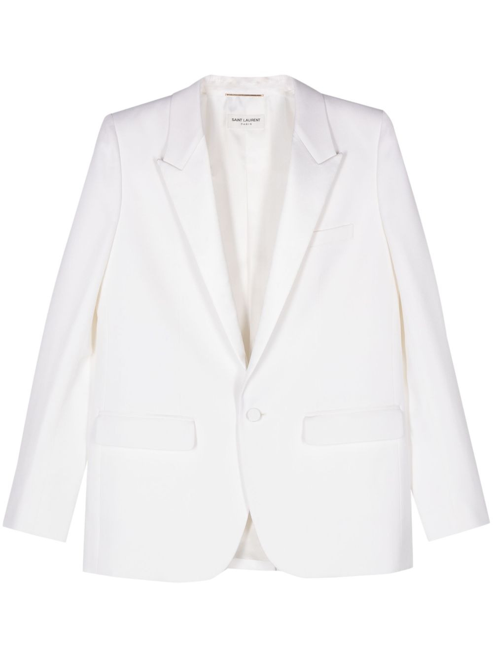 single-breasted tuxedo jacket Saint Laurent showcases its ability to deliver impeccable tailoring with this single-breasted tuxedo jacket. Crafted from sustainable, responsible wool, this piece is finished with a silk satin collar that elevates this sleek formal design. Made in Italy Composition Outer: Wool 100% Lining: Silk 80%, Polyester 20% SIZE & FIT Model measurements Height 5 ft 10 in(1.77 m) Bust/Chest 32.28 in(82 cm) Hips 35.03 in(89 cm) Waist 25.19 in(64 cm) Measurement SLEEVE LENGTH 25.19 in(64 cm) LENGTH 29.92 in(76 cm) Washing instructions Dry Clean Only