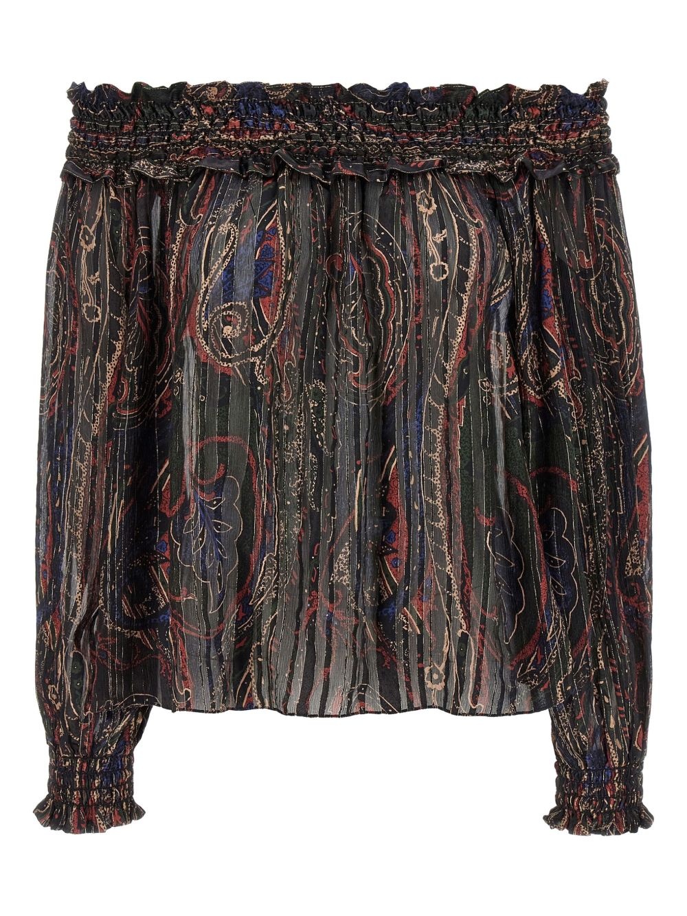smock-stitch blouse Highlights - Black - Off-shoulder - Long sleeves - Elasticated cuffs - Paisley print Made in Italy Composition Silk 98%, Polyester 2%