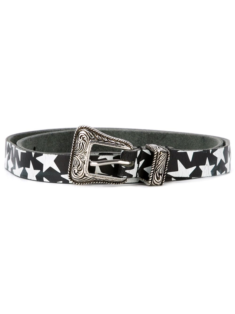 star print belt Black and white bos taurus star print belt from Saint Laurent featuring a d-ring buckle, silver-tone hardware and an adjustable fit. Made in Italy Composition Bos Taurus 100% SIZE & FIT Measurement WIDTH 0.78 in(2 cm) TOTAL LENGTH 37.4 in(95 cm) Minimum Length 33.46 in(85 cm)