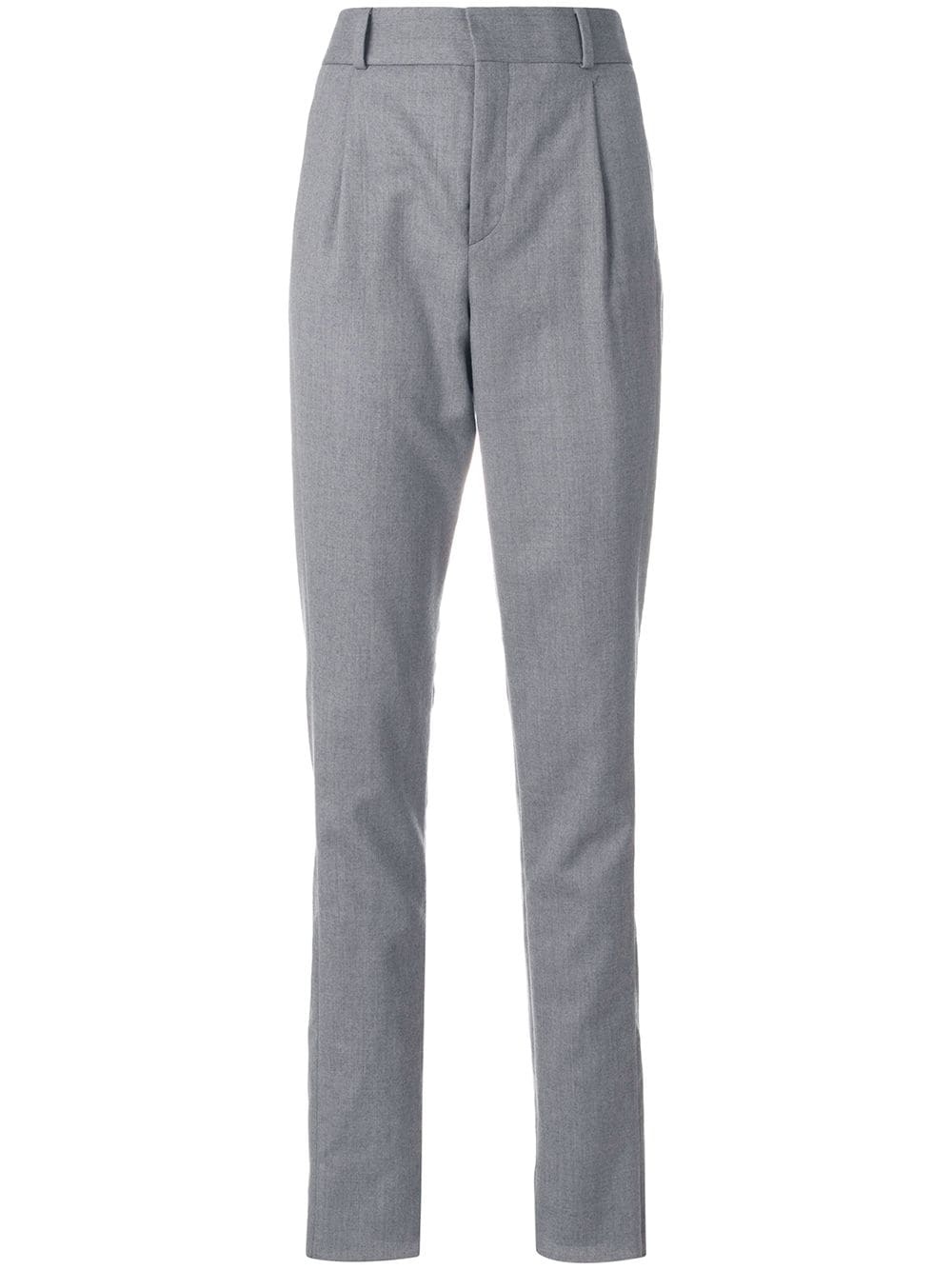 straight-leg tailored trousers Many of Saint Laurent's designs are infused with edgy professionalism, as showcased by these grey tailored trousers from the French fashion house's latest collection. Expertly constructed in Italy from fine cotton and wool, the trousers feature a straight leg, a regular length, a tailored design, a concealed button fastening and a waistband with belt loops. This item fits small, please select half a size up. Made in Italy Composition Lining: Cotton 100% Outer: Wool 100% SIZE & FIT Model measurements Height 5 ft 9 in(1.76 m) Bust/Chest 32.67 in(83 cm) Hips 35.03 in(89 cm) Waist 24.4 in(62 cm) Washing instructions Dry Clean Only