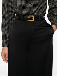 satin trousers Made in France from lightweight silk crepe, these black trousers from Saint Laurent are indicative of the label's penchant for sleek design. They're crafted with a polished front fastening and a straight leg. Highlights - Black - Silk - Satin finish - Tailored design - Palazzo design - Concealed front button fastening - Belt loops - Two side slit pockets - Two rear welt pockets Made in Italy Composition Lining: Silk 100% Outer: Acetate 71%, Viscose 29% SIZE & FIT Model measurements Height 5 ft 11 in(1.8 m) Bust/Chest 33.07 in(84 cm) Hips 37.4 in(95 cm) Waist 25.19 in(64 cm) Measurement INSIDE LEG 34.64 in(88 cm) WAIST 30.7 in(78 cm) HIPS 40.94 in(104 cm) FittingInformation Designed with a wide-leg cut, these trousers allow for a close fit at the waist and offer a loose and roomy fit over the leg Made from a midweight non-stretch fabric This piece fits true to size – take your usual size Washing instructions Dry Clean Only