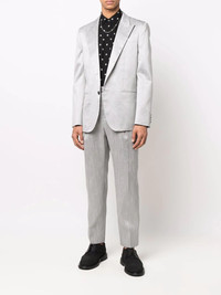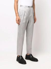 tailored-cut trousers light grey silk-cotton blend belt loops front button and zip fastening two side inset pockets two rear welt pockets Made in Italy Composition Outer: Viscose 86% SIZE & FIT Model measurements Height 6 ft 2 in(1.87 m) Bust/Chest 38.18 in(97 cm) Hips 36.61 in(93 cm) Waist 29.13 in(74 cm) FittingInformation This piece fits true to size. We recommend you get your regular size Cut for a slim fit Made with a mid-weight non-stretch fabric Washing instructions Dry Clean Only