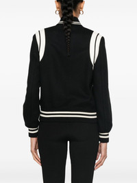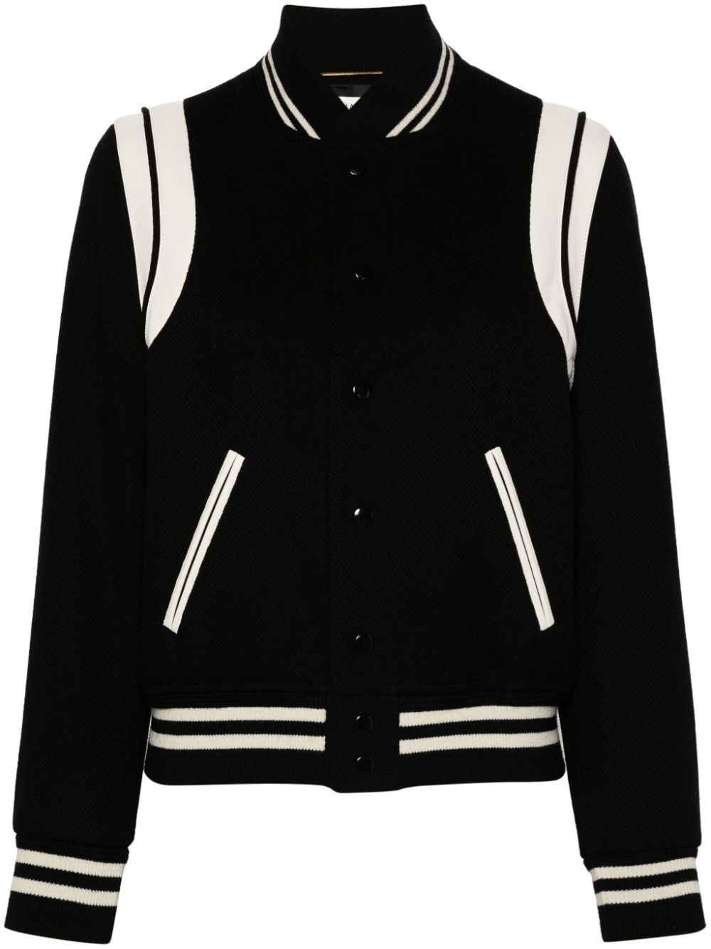 stand-up collar bomber jacket This varsity jacket from Saint Laurent is crafted from a wool blend with a textured finish. It features a contrasting trim in white that adds a preppy feel to the maison's rock'n'roll aesthetic. Highlights - Black/white - Wool blend - Contrasting trim - Stand-up collar - Snap-button fastening - Long sleeves - Two side welt pockets - Ribbed edge Made in Italy Composition Outer: Lamb Skin 100%, Wool 90%, Polyamide 10% Lining: Cupro 60%, Cotton 40% SIZE & FIT Model measurements Height 5 ft 10 in(1.78 m) Bust/Chest 33.07 in(84 cm) Hips 36.61 in(93 cm) Waist 24.8 in(63 cm) FittingInformation Designed for a relaxed fit, this piece allows for comfort and movement when worn The ribbed hem offers a close, comfortable fit Made from a midweight non-stretch fabric This piece fits true to size – if you would prefer a looser fit to layer, take one size up Washing instructions Dry Clean Only