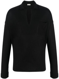 V-neck long-sleeve sweatshirt Saint Laurent presents an innovative reinterpretation of the sweatshirt with this piece from SS23. Crafted from a blend of cashmere, wool and silk, the all-black design boasts a sleek collared V-neck rather than the usual crew-neck construction. Highlights - Black - Wool-cashmere blend - V-neck - Pointed flat collar - Long sleeves - Chest patch pocket - Straight hem Made in Italy Composition Outer: Cashmere 35% SIZE & FIT Model measurements Height 6 ft 1 in(1.85 m) Bust/Chest 38.58 in(98 cm) Hips 37 in(94 cm) Waist 30.31 in(77 cm) FittingInformation Designed for a slim fit, offering a comfortable fit that sits just away from the body Made with a midweight knit, this piece offers some stretch This piece fits true to size – take your usual size