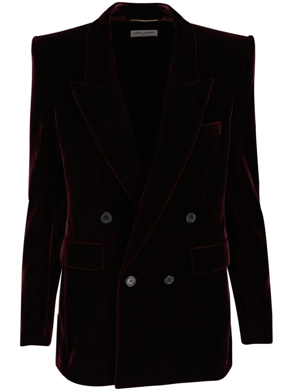 velvet-finish peak-lapels blazer Highlights - Bordeaux red - Velvet finish - Central rear vent - Peak lapels - Double-breasted button fastening - Chest welt pocket - Two front flap pockets - Long sleeves - Buttoned-cuff sleeves - Straight hem Made in Italy Composition Viscose 100% SIZE & FIT Measurement SLEEVE LENGTH 25.19 in(64 cm) LENGTH 29.13 in(74 cm) FittingInformation Designed for a slim fit that sits just away from the body offering a close yet comfortable fit The internal shoulder pads offer a structured shape Made from a midweight non-stretch fabric