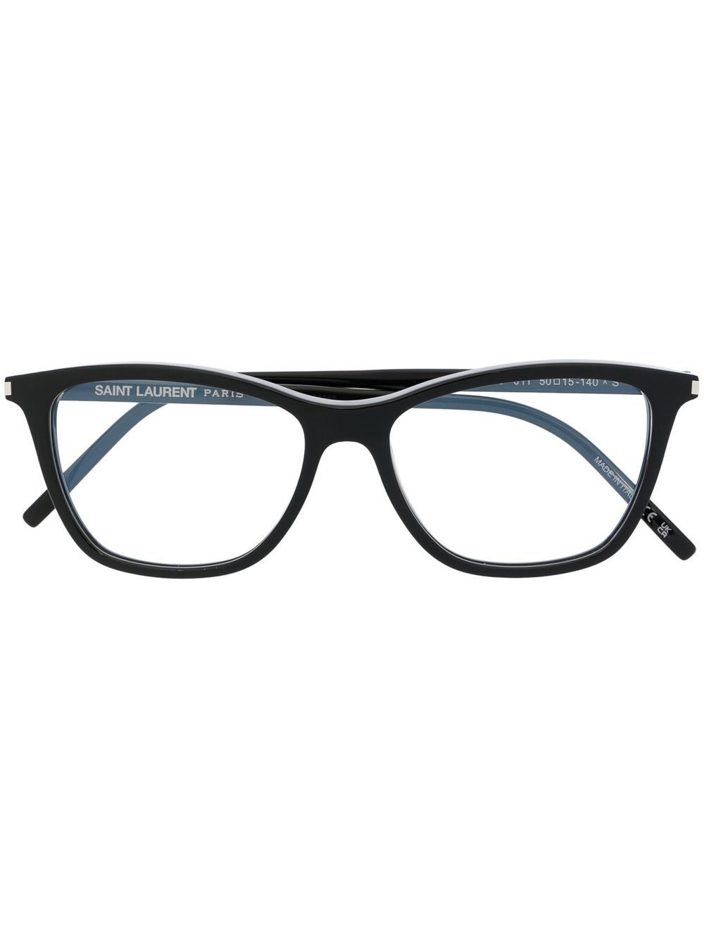 wayfarer-frame glasses jet black wayfarer frame clear lenses straight arms All glasses from FARFETCH are sold as non-prescription frames. These glasses come with a protective case. Made in Italy Composition Outer: Acetate 100% SIZE & FIT Measurement Arm Length 5.51 in(14 cm) Bridge Width 0.59 in(1.5 cm) Lens Diameter 1.96 in(5 cm)