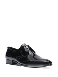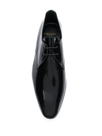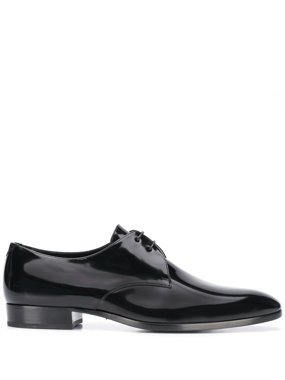 Wyatt varnished leather Derby shoes Put your best foot forward. Swap your old lace-up shoes for these high-shine Derby shoes from Saint Laurent. Make the best impression. Highlights - Black - Leather - High-shine finish - Almond toe - Front lace-up fastening - Branded insole - Flat leather sole Made in Italy Composition Outer: Leather 100% Lining: Leather 100% Sole: Leather 100% SIZE & FIT Measurement HEIGHT 1.18 in(3 cm) Sole height 0.39 in(1 cm)