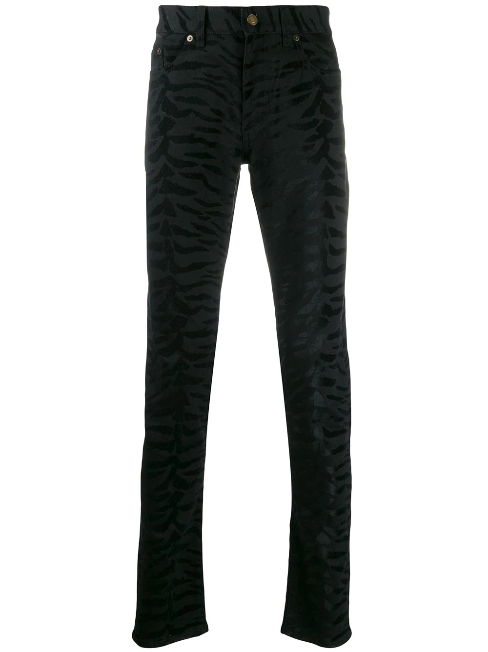 zebra printed skinny jeans Life would be boring without Saint Laurent. Amp up your weekend style with these black cotton zebra-printed skinny jeans. We know you can pull them off. Featuring a button and zip fly, belt loops, a five pocket design, a slim fit and a zebra pattern. Made in Italy Composition Cotton 98%, Spandex/Elastane 2% SIZE & FIT Model measurements Height 6 ft 1 in(1.85 m) Bust/Chest 35.82 in(91 cm) Hips 37.79 in(96 cm) Waist 29.13 in(74 cm) Washing instructions Dry Clean Only