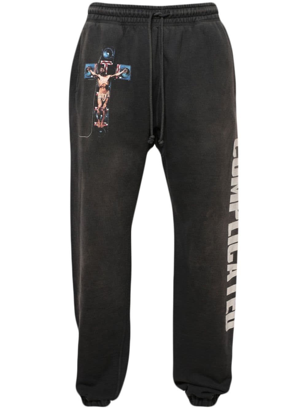 Complicated cotton track pants Highlights - Black - Cotton - Washed - Slogan print - Elasticated drawstring waistband - Two side slit pockets - Rear patch pocket - Elasticated ankles Imported Composition Cotton 100%
