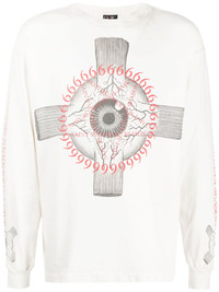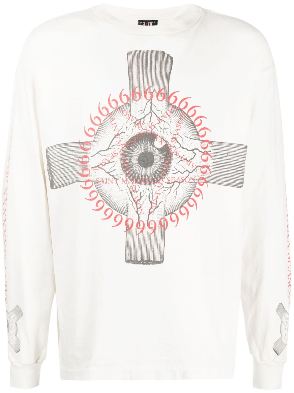 graphic-print long-sleeve T-shirt SAINT MXXXXXX's concept is all about streetwear inspired by vintage, as showcased by this T-shirt. The white-hued garment is enhanced by a graphic print and features long sleeves. Highlights - Optical white - Cotton - Graphic print to the front - Graphic print to the rear - Logo print at the sleeve - Crew neck - Long sleeves - Ribbed cuffs - Straight hem Imported Composition Cotton 100% SIZE & FIT Model measurements Height 6 ft 2 in(1.87 m) Bust/Chest 36.22 in(92 cm) Hips 37.79 in(96 cm) Waist 28.34 in(72 cm) FittingInformation Designed to be unstructured, offering a loose fit throughout Made from a midweight non-stretch fabric, this piece offers minimal elasticity when worn This piece fits true to size – take your usual size Washing instructions Machine Wash