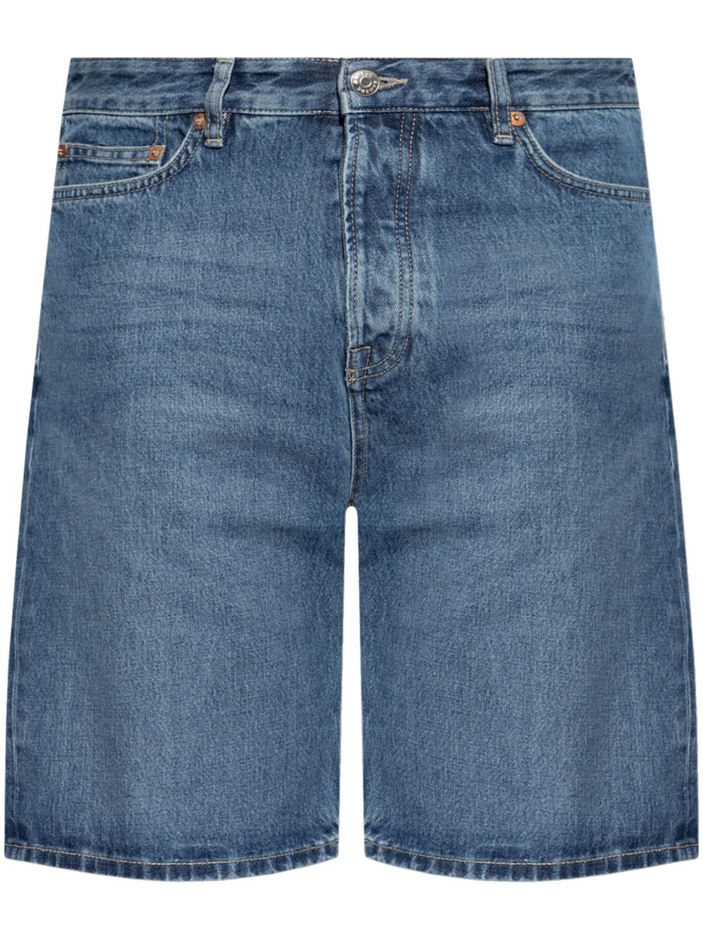 knee-length denim shorts Highlights - Blue - Cotton - Denim - Whiskering effect at the thighs - Logo patch to the rear - Belt loops - Knee-length - Front button and zip fastening - Classic five pockets Imported Composition Cotton 100%