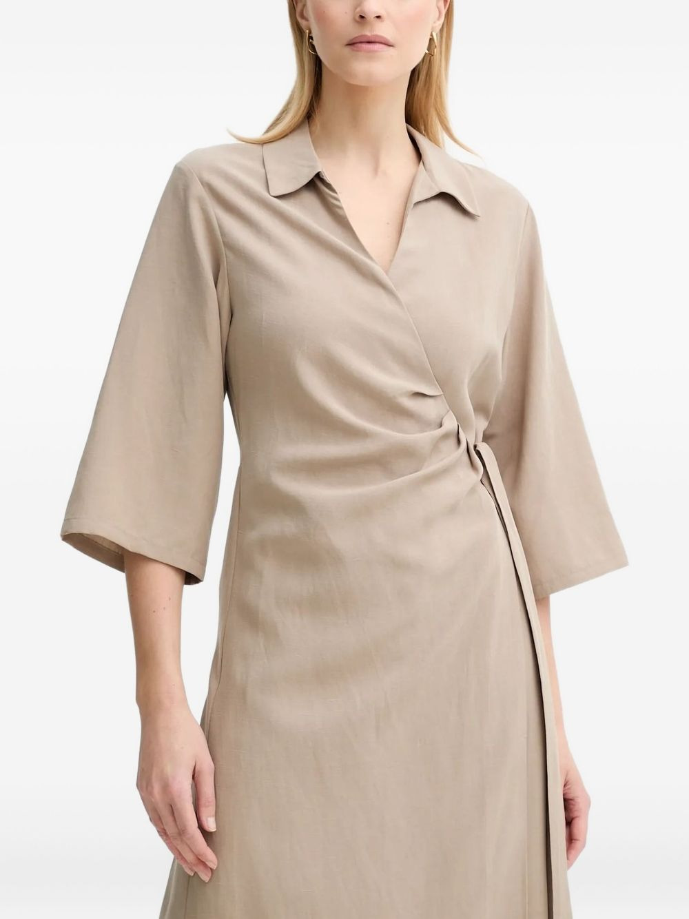 wrap-effect quarter-sleeve midi dress Highlights - Beige - Wrap effect - Self-tie belt - Three-quarter sleeves - Point collar - Midi length Imported Composition TENCEL™ Lyocell (LENZING) 100%, Linen/Flax 100%