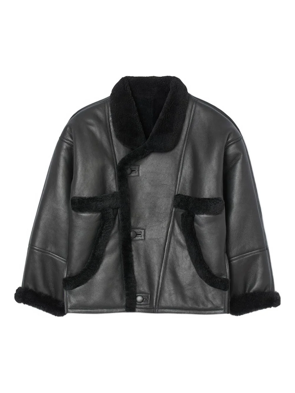 black leather coat Highlights - Black - Shearling trim - Button fastening - Patch pockets - Notched lapel - Long sleeves Imported Composition Lambskin 100%, Lamb Shearling 100% Washing instructions Read Manufacturer Guidelines