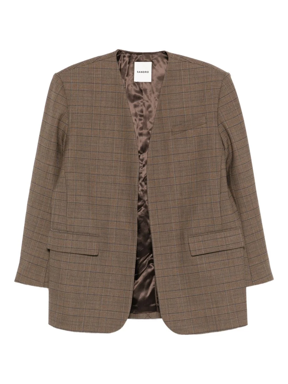 checked-pattern blazer Highlights - Brown - Checked pattern - Collarless - Welt flap-pockets - Long sleeves Imported Composition Outer: Polyester 52%, Wool 26%, Viscose 18%, Elastane 4% Lining: Viscose 100%, Cotton 100% SIZE & FIT Model measurements Height 5 ft 9 in(1.75 m) Bust/Chest 34.64 in(88 cm) Hips 36.61 in(93 cm) Waist 26.37 in(67 cm) Washing instructions Dry Clean Only