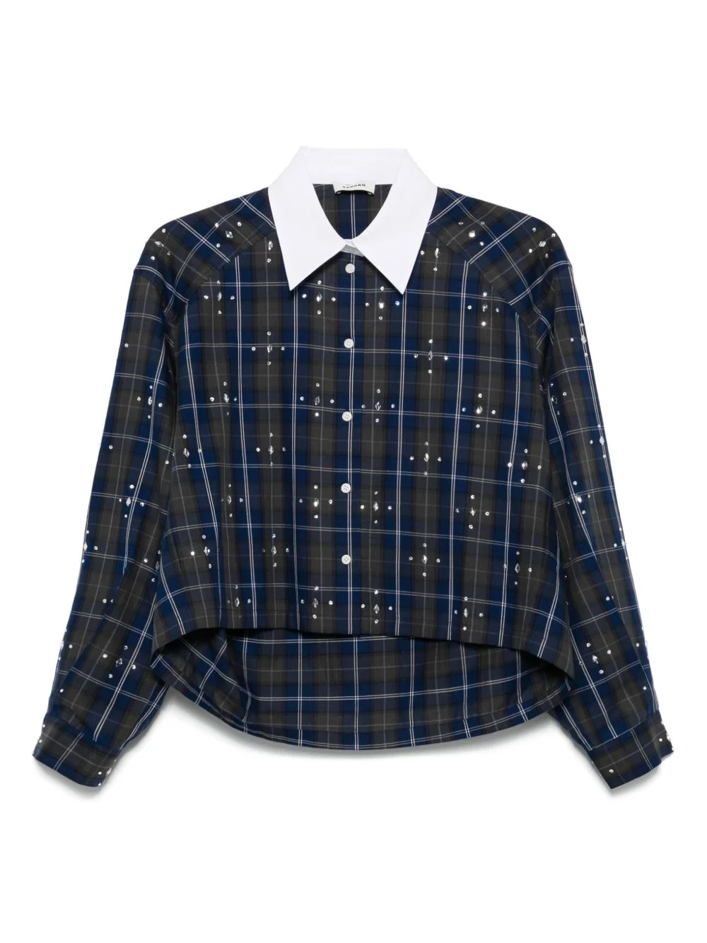 checked shirt Highlights - Navy blue - Front button fastening - Buttoned-cuff sleeves - High-low hem - Crystal embellishment Imported Composition Cotton 50%, Organic Cotton 50% SIZE & FIT Model measurements Height 5 ft 10 in(1.79 m) Bust/Chest 35.43 in(90 cm) Hips 35.03 in(89 cm) Waist 25.19 in(64 cm) FittingInformation Designed to be unstructured, offering a loose fit throughout Cropped in length Made from a midweight non-stretch fabric Washing instructions Hand Wash