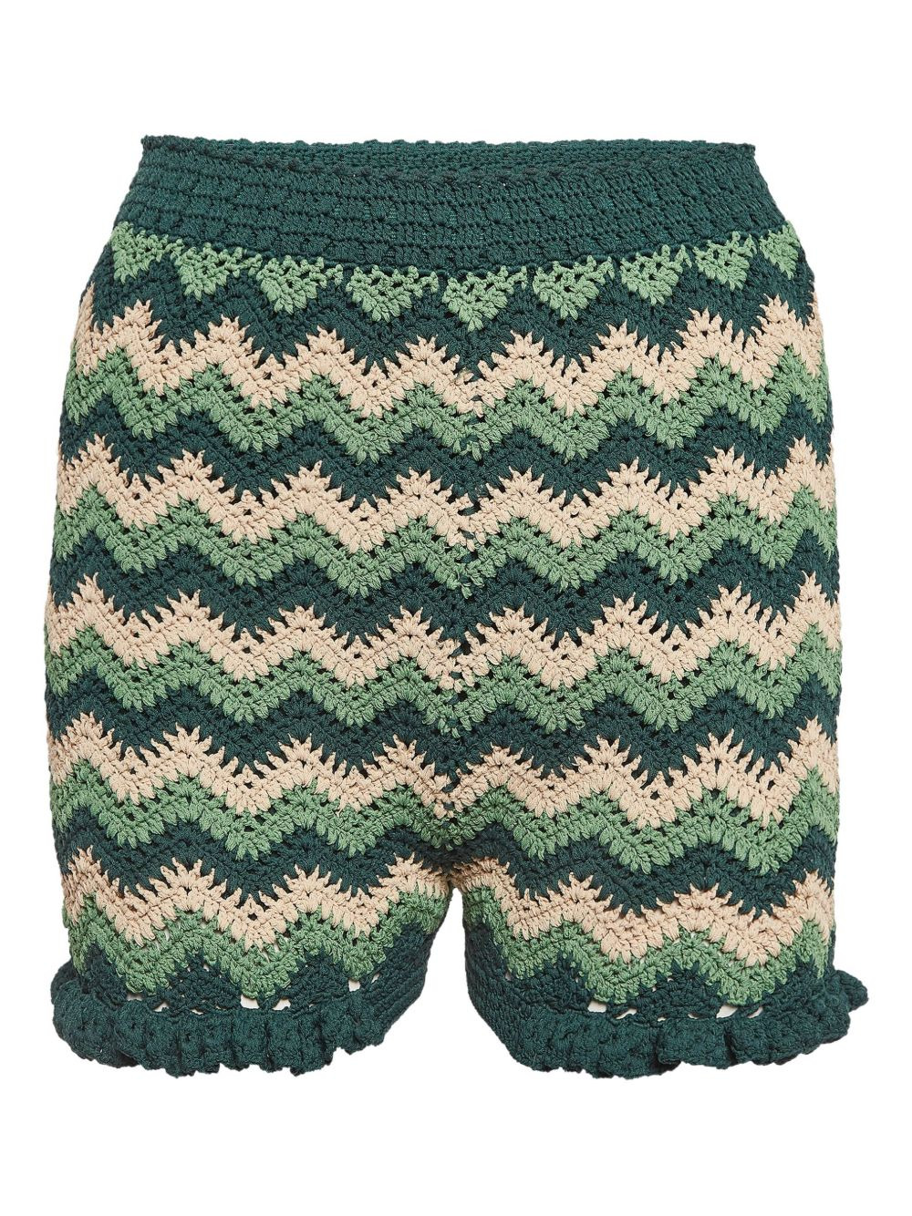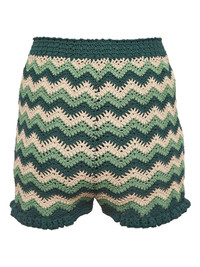 chevron crochet shorts Highlights - Green - Chevron pattern - Crochet knit - Ruffle trim - Textured fabric - Condition: good. this previously owned and used item is in good condition with minimal signs of use. this may include fading of material or plating and scratches. Imported Composition Outer: Viscose 62%, Polyamide 38% Lining: Viscose 62%, Polyamide 38% Washing instructions Read Manufacturer Guidelines