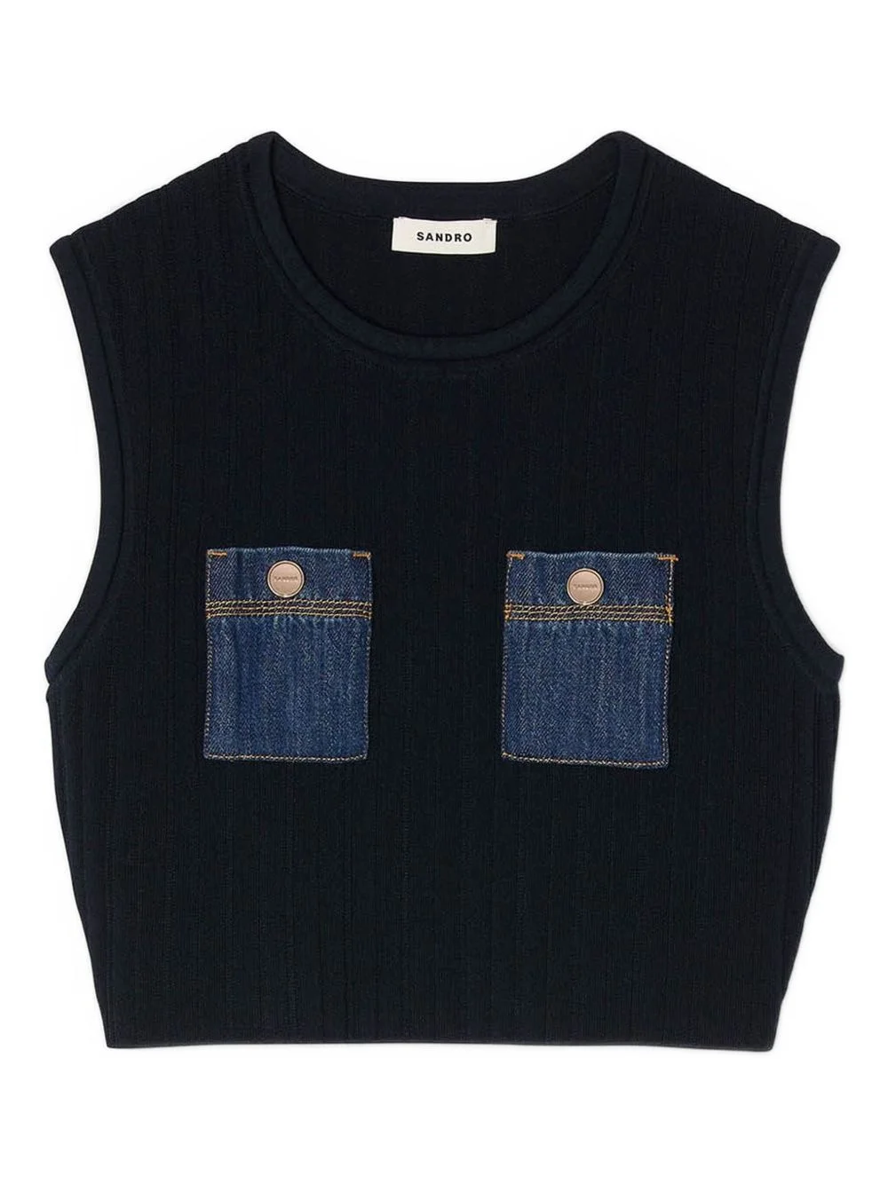 denim-pockets sleeveless top Highlights - Blue - Ribbed knit - Two front patch pockets - Round neck Imported Composition Outer: Viscose 52%, Polyamide 46%, Elastane 2% Lining: Cotton 91%, Polyester 4%, Viscose 4%, Lyocell 1% Washing instructions Hand Wash