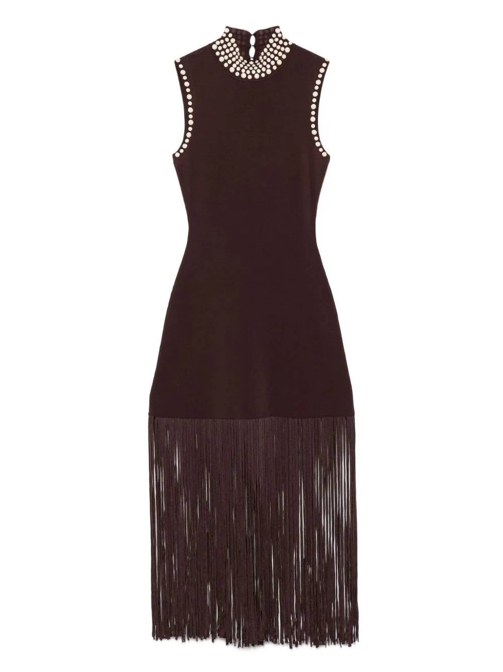 high-neck fringe dress Highlights - Brown - High neck - Sleeveless - Faux-pearl embellishment - Fringed hem Imported Composition Viscose 77%, Polyamide 21%, Elastane 2% SIZE & FIT Model measurements Height 5 ft 10 in(1.77 m) Bust/Chest 33.07 in(84 cm) Hips 37 in(94 cm) Waist 24.8 in(63 cm) FittingInformation Designed for a close fit throughout Made with a midweight knit, this piece offers some stretch Washing instructions Dry Clean Only