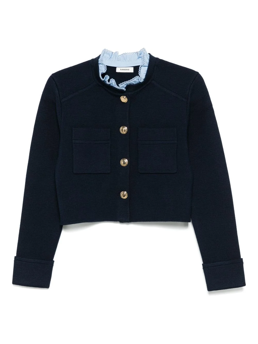 knitted cardigan Highlights - Navy blue - Front button fastening - Ruffle collar - Long sleeves Imported Composition Cotton 100%, Wool 45%, Acrylic 45%, Polyamide 10% SIZE & FIT Model measurements Height 5 ft 10 in(1.79 m) Bust/Chest 33.07 in(84 cm) Hips 35.82 in(91 cm) Waist 24.01 in(61 cm) FittingInformation Designed for a slim fit that sits just away from the body offering a close yet comfortable fit Made with a midweight knit, this piece offers some stretch Washing instructions Hand Wash