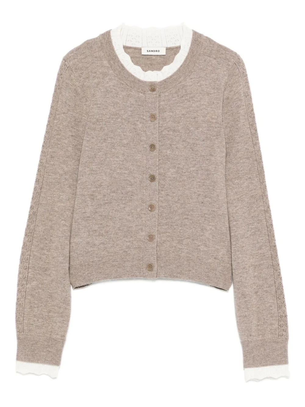 lace-trimmed cardigan Highlights - Taupe - Scalloped lace trim - Button front fastening - Round neck - Long sleeves Imported Composition Viscose 62%, RWS Wool 50%, Wool 40%, Polyester 22%, Polyamide 14%, Cashmere 10%, Elastane 2% SIZE & FIT Model measurements Height 5 ft 10 in(1.79 m) Bust/Chest 31.88 in(81 cm) Hips 35.43 in(90 cm) Waist 23.62 in(60 cm) Washing instructions Hand Wash