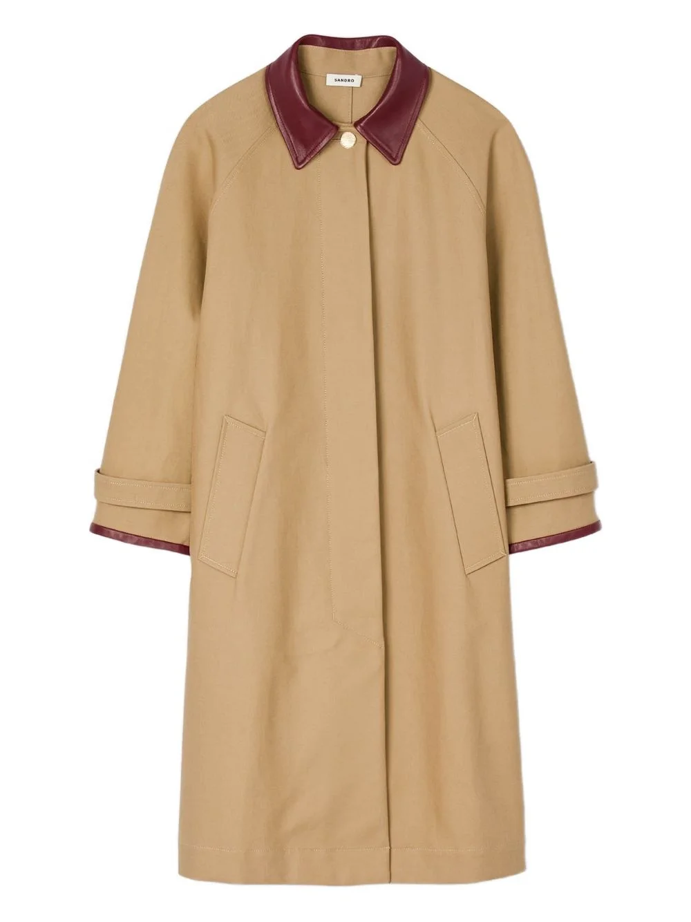 leather-trimmed sleeves coat Highlights - Beige - Leather collar - Raglan sleeves - Button fastening - Piped trim - Shirt collar Imported Composition Fabric 100% Washing instructions Read Manufacturer Guidelines