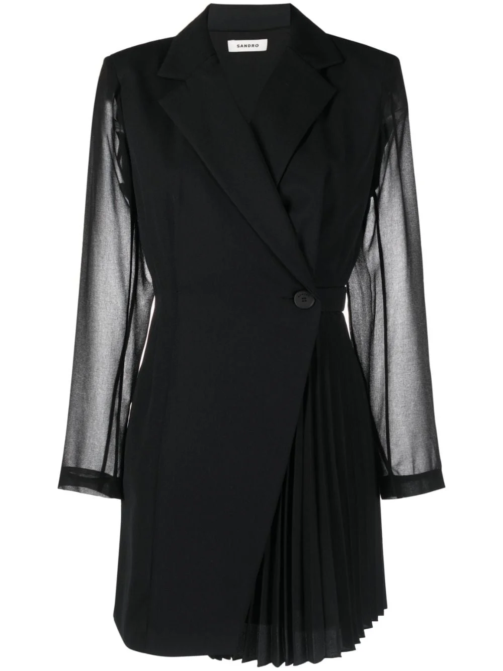 panelled blazer dress A play on structure and fluidity, this SANDRO dress is spliced with a precision-pleated panel at the hip and sheer georgette sleeves that sit in fluid contrast to the tailored blazer bodice. Highlights - Black - Virgin wool blend - Notched lapels - Off-centre front button fastening - Long sheer sleeves - Pleated skirt - Thigh-length Imported Composition Outer: Polyester 55%, Virgin Wool 45% Lining: Polyester 100% SIZE & FIT Model measurements Height 5 ft 10 in(1.78 m) Bust/Chest 30.7 in(78 cm) Hips 34.64 in(88 cm) Waist 23.22 in(59 cm) FittingInformation Designed for a slim fit that sits just away from the body offering a close yet comfortable fit Made from a midweight non-stretch fabric This piece fits true to size – take your usual size