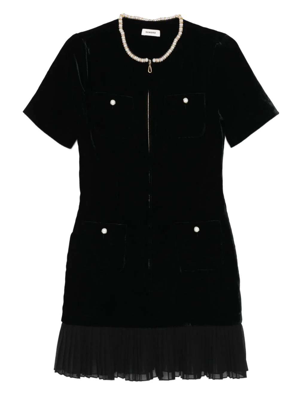 pearl-embellished pleated-hem dress Highlights - Black - Velvet - Zip front fastening - Faux-pearl embellishments - Short sleeves - Pleated hem - Flap pockets Imported Composition Fabric 100% SIZE & FIT Model measurements Height 5 ft 11 in(1.8 m) Bust/Chest 31.49 in(80 cm) Hips 36.61 in(93 cm) Waist 24.4 in(62 cm) Washing instructions Read Manufacturer Guidelines