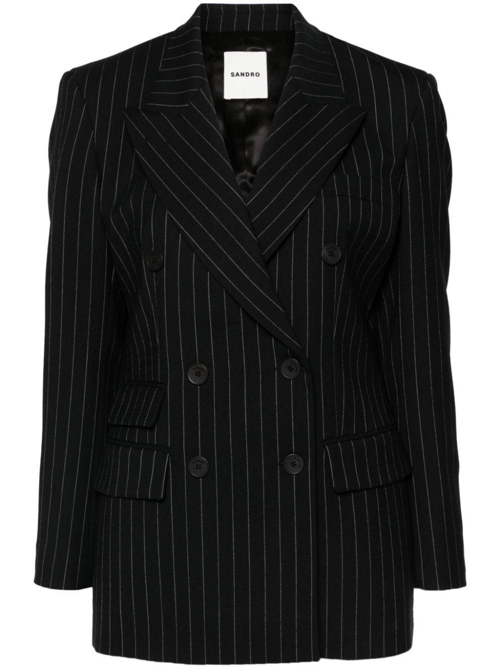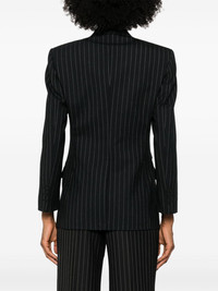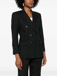 pinstriped double-breasted blazer Highlights - Black - Interlock twill weave - Pinstripe pattern - Peak lapels - Double-breasted button fastening - Shoulder pads - Long sleeves - Buttoned cuffs - Chest welt pocket - Two front flap pockets - Italian rear vents - Straight hem - Full lining Imported Composition Outer: Recycled Polyester 54%, RWS Wool 44%, Elastane 2% Lining: Viscose 100%, Cotton 100% SIZE & FIT Model measurements Height 5 ft 11 in(1.8 m) Bust/Chest 32.67 in(83 cm) Hips 35.82 in(91 cm) Waist 25.98 in(66 cm) FittingInformation Designed for a slim fit that sits just away from the body offering a close yet comfortable fit The internal shoulder pads offer a structured shape Made from a midweight fabric This piece fits true to size – take your usual size Washing instructions Dry Clean Only