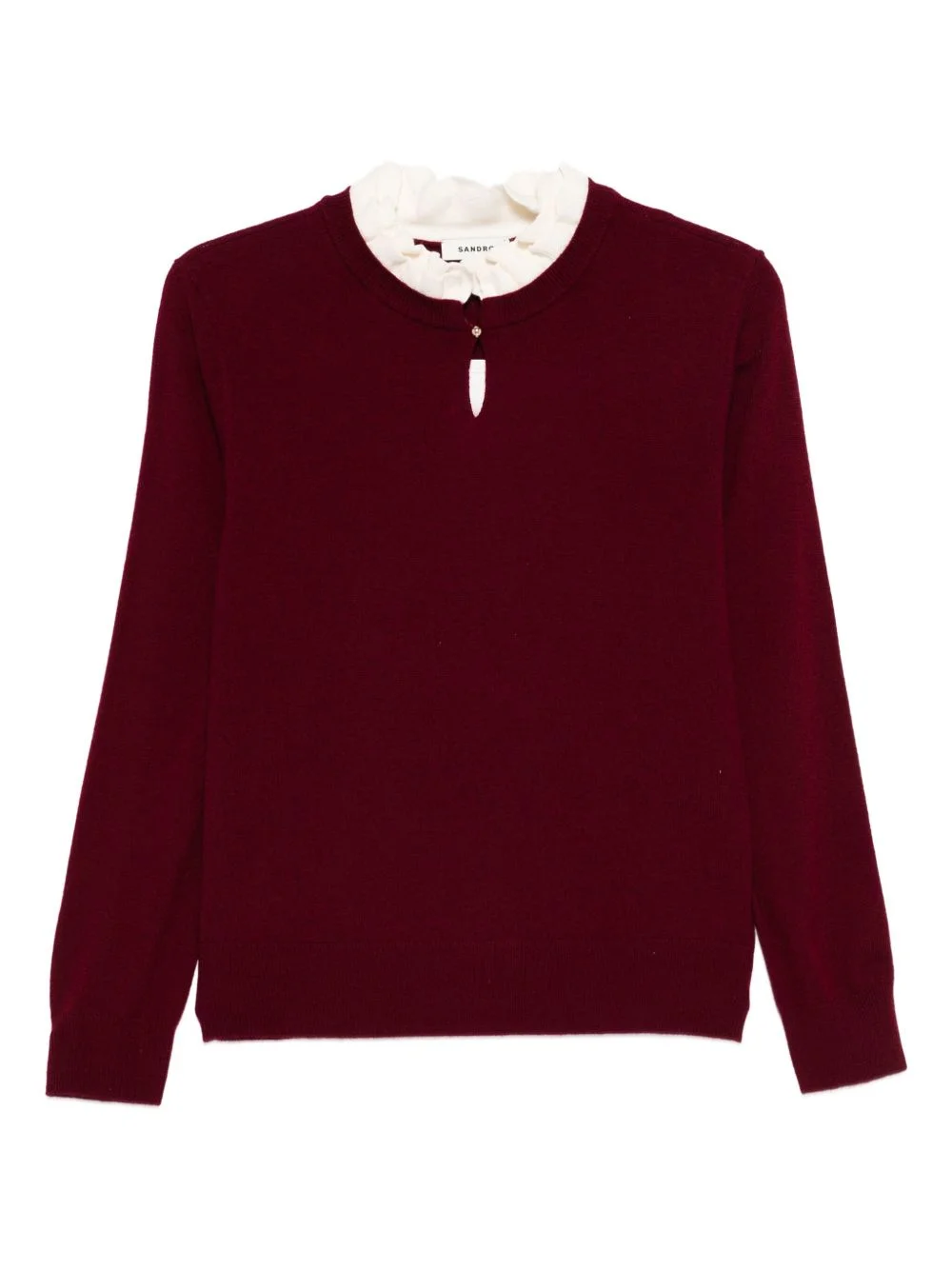 ruffled-collar sweater Highlights - Burgundy - Ruffled neckline - Keyhole detail - Long sleeves Imported Composition RWS Wool 95%, Cashmere 5% SIZE & FIT Model measurements Height 5 ft 10 in(1.79 m) Bust/Chest 31.88 in(81 cm) Hips 35.43 in(90 cm) Waist 23.62 in(60 cm) Washing instructions Read Manufacturer Guidelines