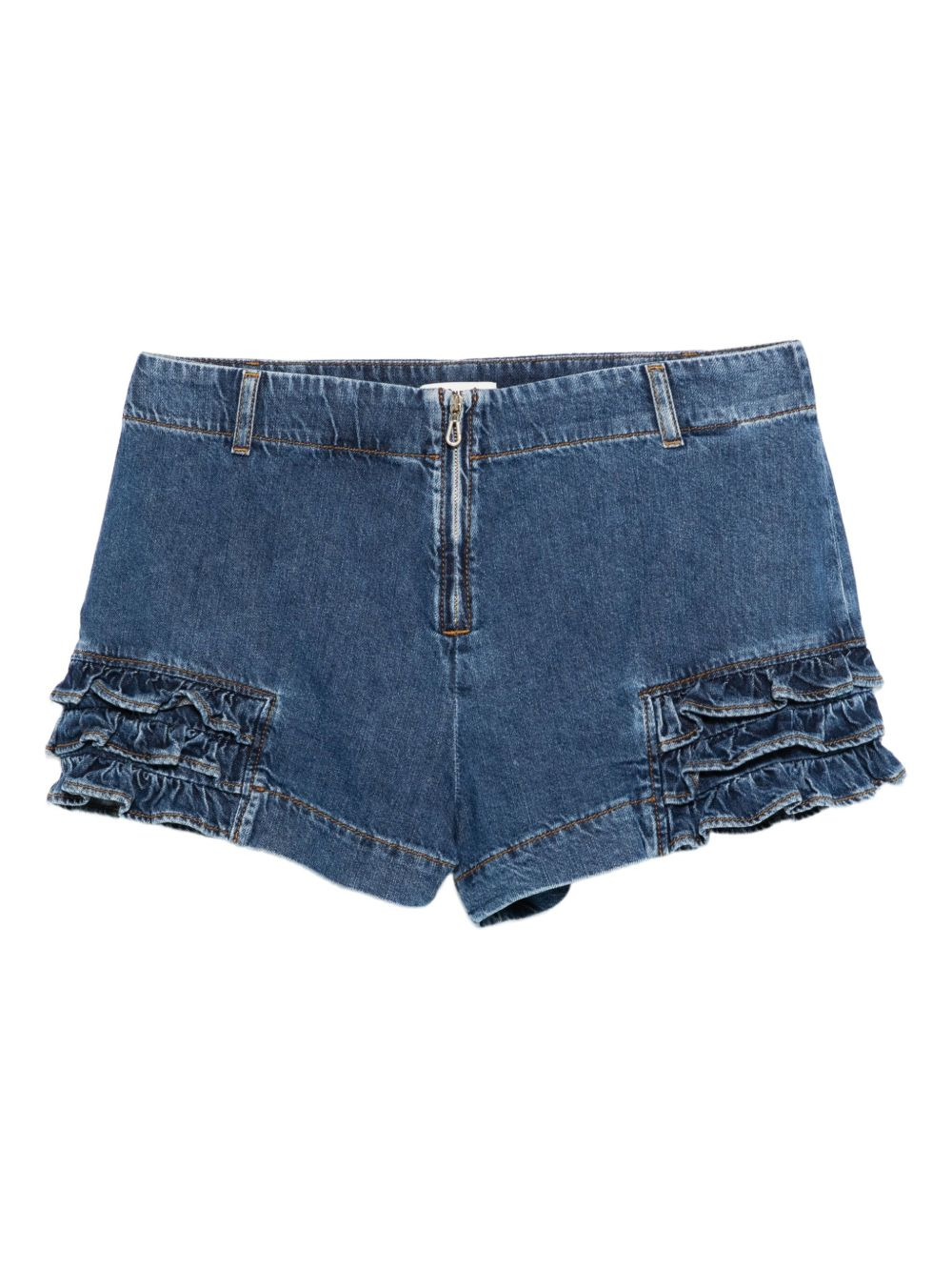 ruffled-detail denim shorts Highlights - Blue - Ruffled detailing - Zip fly - High waist - Five-pocket Imported Composition Cotton 100% Washing instructions Machine Wash