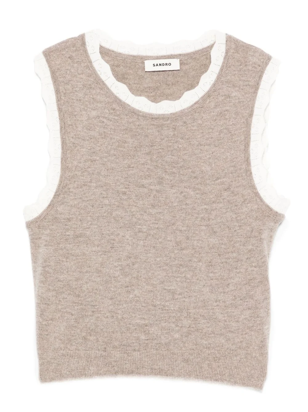 scalloped-trim sleeveless top Highlights - Taupe beige - Cashmere-wool blend - Scalloped trim - Sleeveless - Round neck - Cropped length Imported Composition Viscose 62%, RWS Wool 50%, Wool 40%, Polyester 22%, Polyamide 14%, Cashmere 10%, Elastane 2% SIZE & FIT Model measurements Height 5 ft 10 in(1.79 m) Bust/Chest 31.88 in(81 cm) Hips 35.43 in(90 cm) Waist 23.62 in(60 cm) Washing instructions Hand Wash