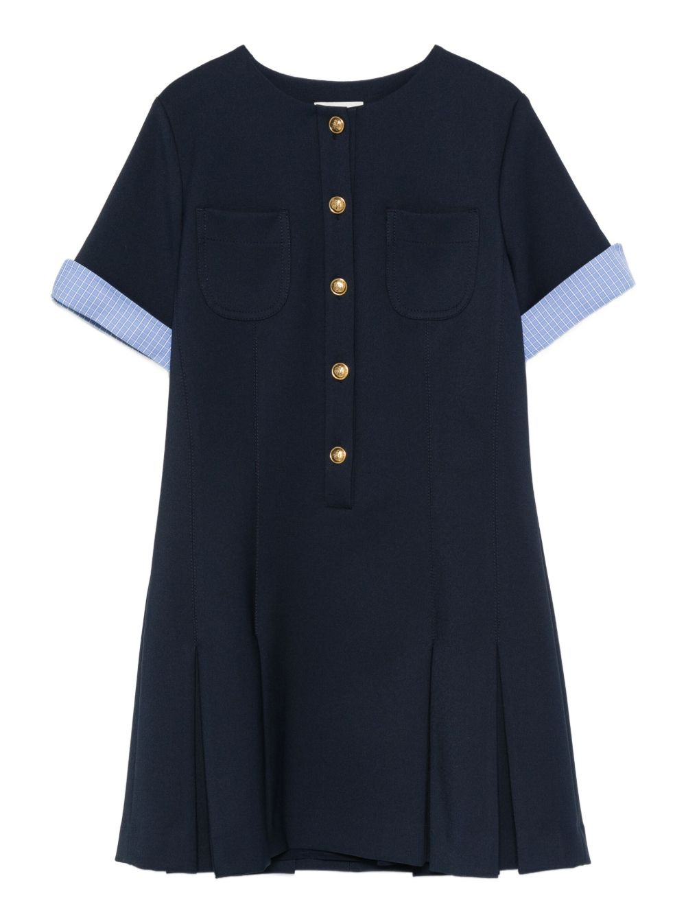 short sleeve dress Highlights - Navy blue - Front button fastening - Pleated skirt - Short sleeves - Patch chest pockets Imported Composition Polyester 91%, Spandex/Elastane 9% SIZE & FIT Model measurements Height 5 ft 10 in(1.79 m) Bust/Chest 31.88 in(81 cm) Hips 35.43 in(90 cm) Waist 23.62 in(60 cm) Washing instructions Dry Clean Only