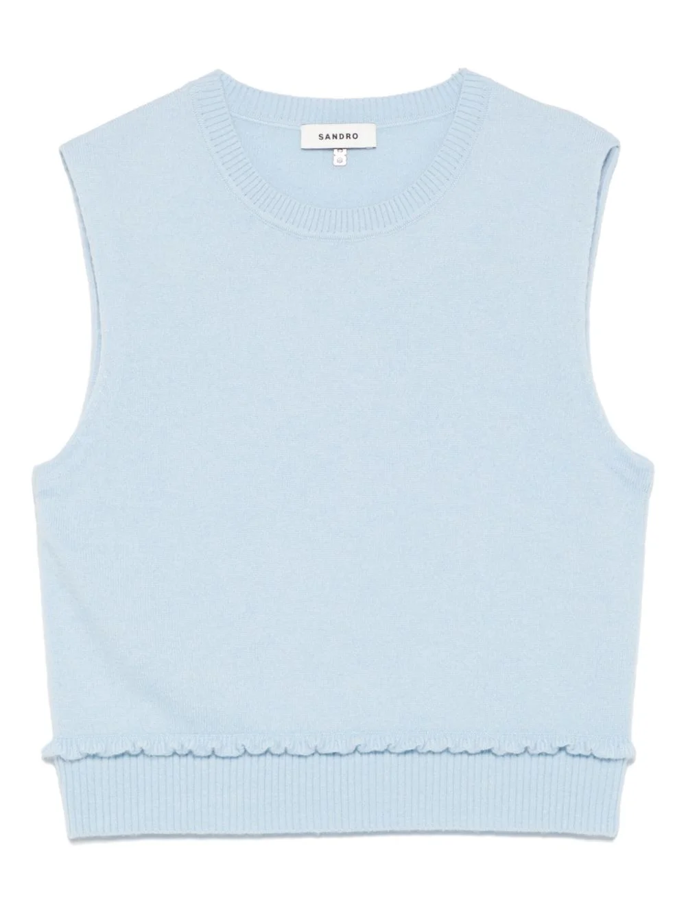 sleeveless top Highlights - Blue - Crew neck - Sleeveless - Ruffled detailing - Straight hem Imported Composition Fabric 100% SIZE & FIT Model measurements Height 5 ft 10 in(1.78 m) Bust/Chest 31.49 in(80 cm) Hips 37 in(94 cm) Waist 23.62 in(60 cm) FittingInformation Designed for a slim fit that sits just away from the body offering a close yet comfortable fit Made from a midweight non-stretch fabric, this piece offers minimal elasticity when worn Washing instructions Hand Wash