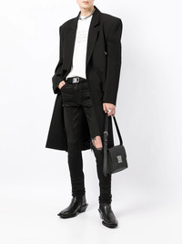 black wool coat black virgin wool double-breasted button fastening long sleeves central rear vent chest patch pocket Imported Composition Virgin Wool 100% SIZE & FIT Model measurements Height 6 ft 2 in(1.87 m) Bust/Chest 35.43 in(90 cm) Hips 36.41 in(92.5 cm) Waist 27.55 in(70 cm) FittingInformation This piece fits true to size. We recommend you get your regular size Cut for a loose fit Made with a mid-weight non-stretch fabric Washing instructions Hand Wash
