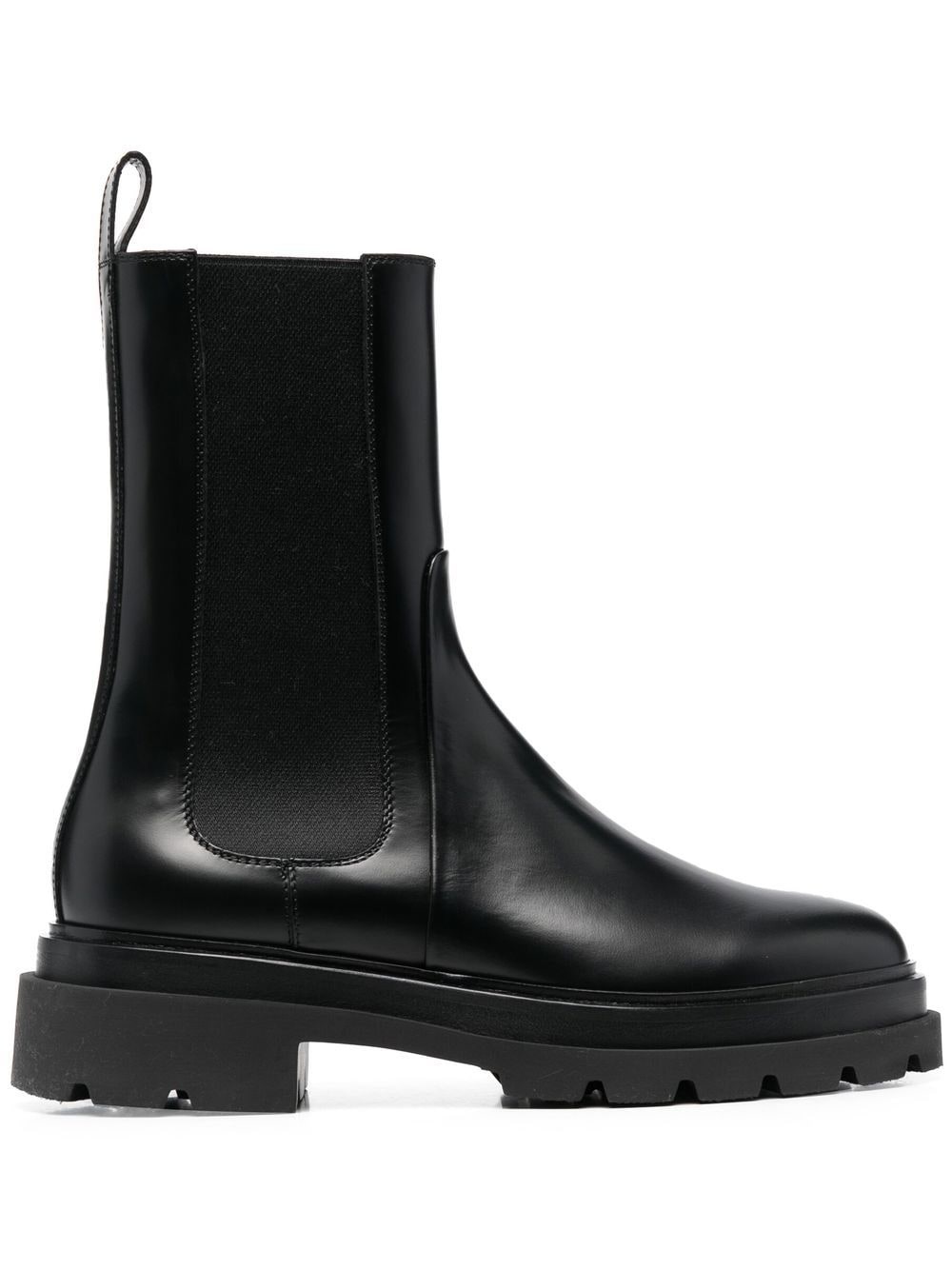 elasticated side-panel Chelsea boots Known for their timeless footwear designs, Santoni presents these Chelsea boots for its AW23 collection. Crafted from shiny calf leather, they rest on a chunky rubber lug sole. Highlights - Jet black - Calf leather - Ankle length - Pull-tab at the heel - Elasticated side panels - Round toe - Branded insole - Flat rubber sole Made in Italy Composition Leather 100%