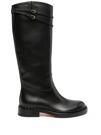 knee-length leather boots Showing the brand's Italian know-how, these knee-length boots from Santoni feature a smooth leather construction. The pair sits atop a flat sole and is adorned with two buckle-fastening ankle straps. Highlights - Black - Calf leather - Round toe - Buckle-fastening ankle strap - Slip-on style - Flat sole Made in Italy Composition Outer: Calf Leather 100% Sole: Calf Leather 100%, Rubber 100% Lining: Calf Leather 100% SIZE & FIT Measurement CIRCUMFERENCE 14.56 in(37 cm) HEEL 1.18 in(3 cm) HEIGHT 14.37 in(36.5 cm) Sole height 0.59 in(1.5 cm)